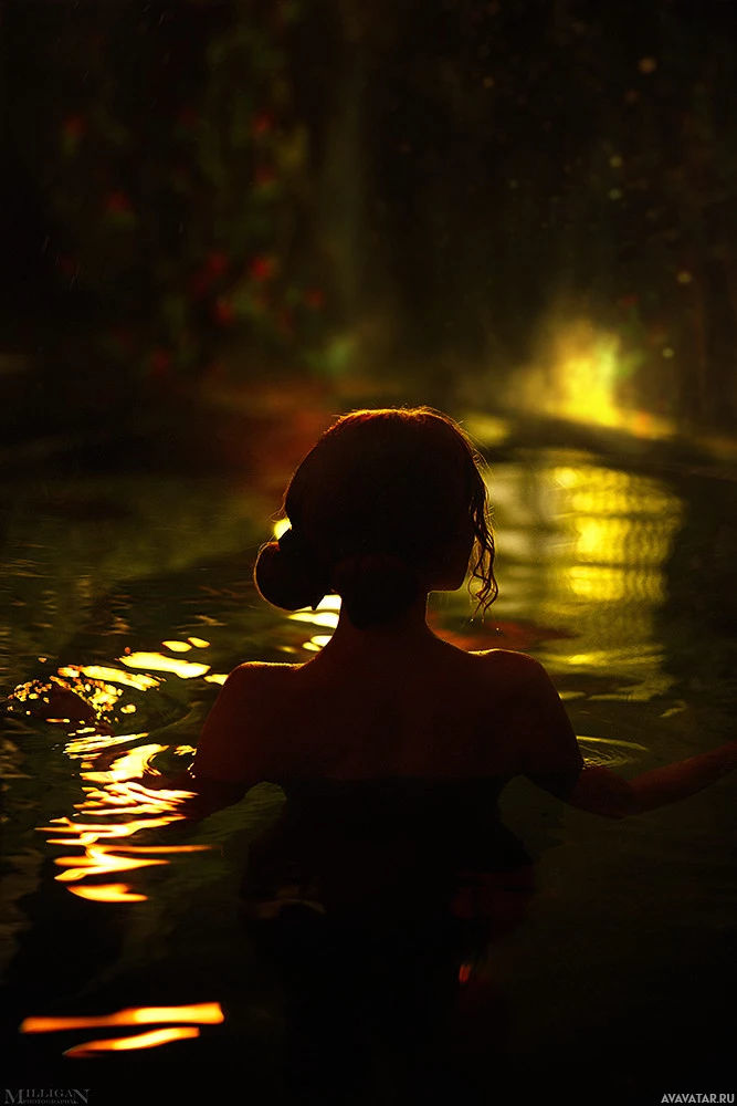 The image depicts a person in water, illuminated by a warm