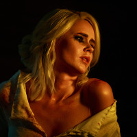 blonde hair and is wearing what looks like a torn shirt or dress with blood splatters on it, which might suggest she's in the middle of an action-packed scene from a game or movie. The lighting is moody and dark, highlighting her face and upper body while leaving much of the rest in shadow. Her expression seems to convey emotion that could be interpreted as fear or intensity. This character resembles Ciri from "The Witcher 3: Wild Hunt," a popular video