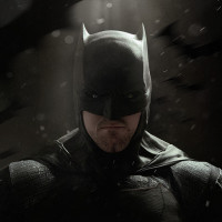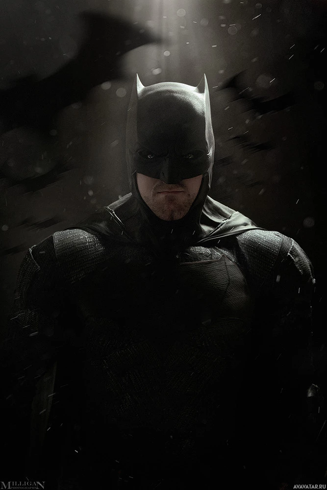 The image features a character wearing the Batman costume, which is iconic to the fictional comic