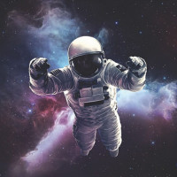 This image features an astronaut wearing a space suit, floating in space. The astronaut appears to be holding onto something and is surrounded by the cosmic beauty of deep space with nebulae and stars in the background.