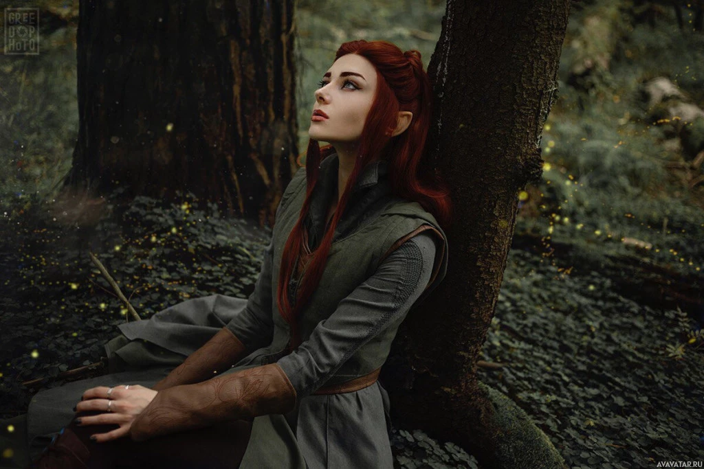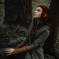 red hair. She is sitting on the ground, leaning against a tree, and appears to be in a contemplative or restful state. The background suggests a forest setting with foggy conditions that add to