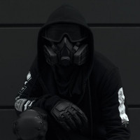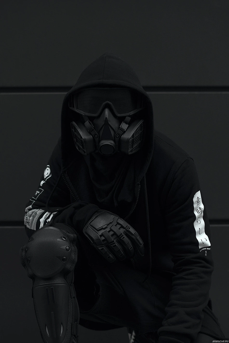 На картинке изображен человек, одетый в костюм всего тела, который включает капюшон, маску респиратора и перчатки. Наряд имеет темную цветовую гамму с контрастными белыми акцентами на руках и плечах. Человек сидит или приседает к серой стене или поверхности.