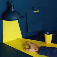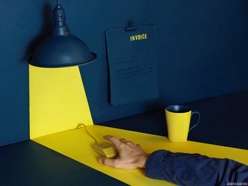 light sources in the scene, including what appears to be a desk lamp and some ambient light that creates shadows on the wall behind the person. In the background, there are two