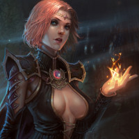 magical flame from her hand. Her expression is focused or intense, suggesting she may be in the middle of performing a spell or engaged in battle. The background suggests a mystical or fantastical setting, with mist and