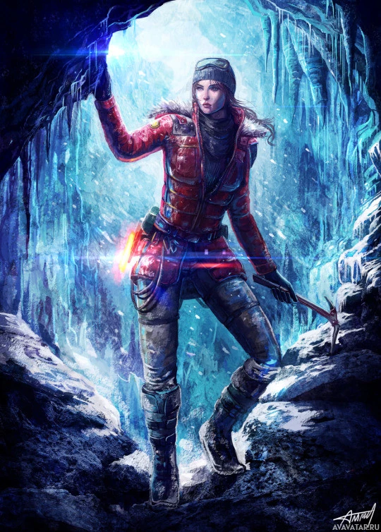 ice formations around her. The character is dressed in cold-weather gear, suggesting she is on an adventure in