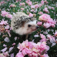 На картинке изображен еж, стоящий среди розовых цветов. Ежик характеризуется колючими волосами и имеет открытый рот, возможно, глядя или обнюхивая что-то вокруг него. Обстановка выглядит как открытая площадка с травой под цветами, что указывает на природную среду.