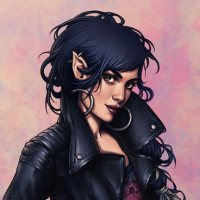 dark hair and is wearing a black leather jacket over a pink shirt, with denim jeans and boots. Her expression is serious or contemplative, and she seems to be looking slightly away from the viewer. The style of the image is typical of comic