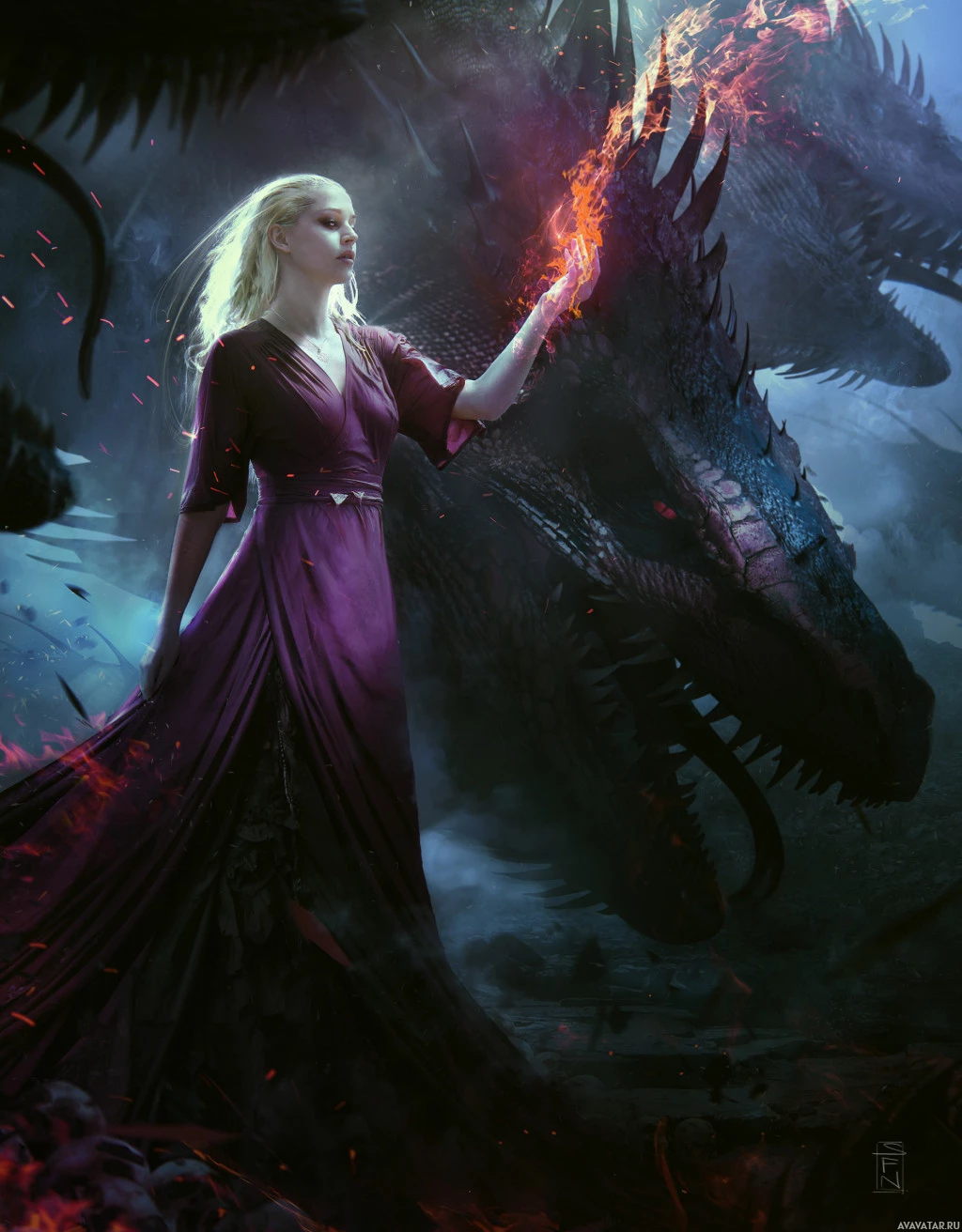 a fantasy scene with a woman standing in front of two dragons. She is dressed in a long purple dress and has an ethereal appearance, suggesting she might be a character from