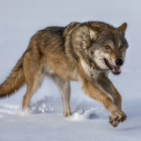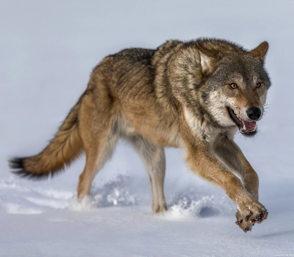 На снимке изображен волк в снегу. Волк, кажется, захвачен в середине полосы, его передние лапы подняты, как будто он идет или бежит. На земле виден снег, указывающий на холодные погодные условия.