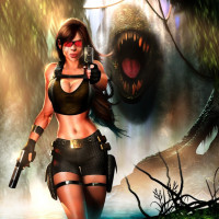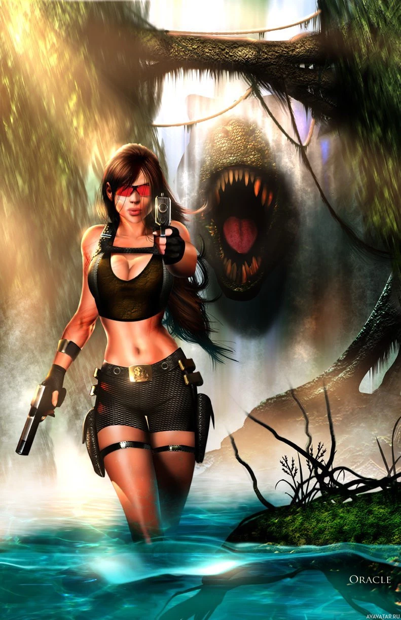 a tank top with a high slit on the side revealing her midriff, and she's holding a gun in one hand while pointing with the other. She also wears a holster with a pistol. In the background, there are jungle-like vegetation and what seems to be a river. Above the character, there is an image of