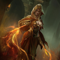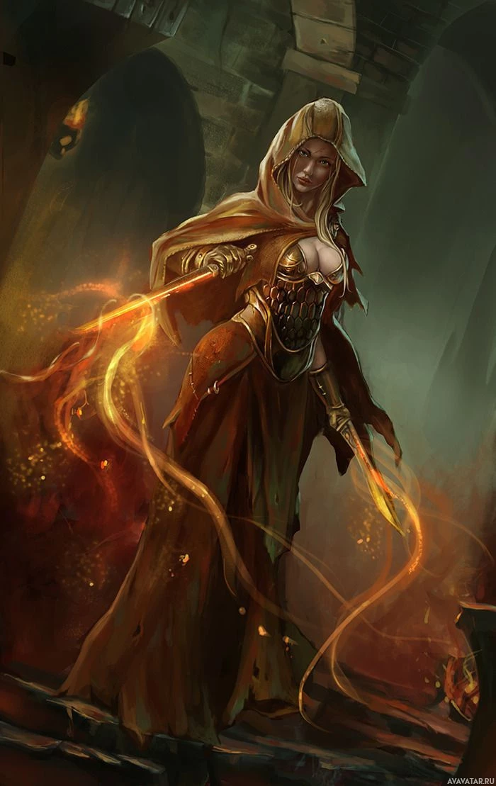 fantasy character. She is depicted wearing a medieval-style robe with a hood that obscures her face, giving her