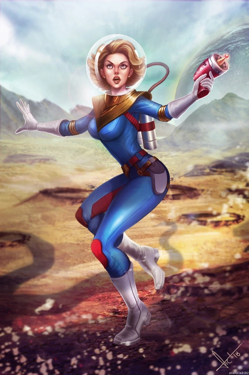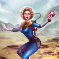 a female character dressed in a blue and red space suit, reminiscent of those worn by astronauts. She has
