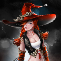 red hair, wearing a witch hat and attire typically associated with a fantasy or Halloween theme. She is surrounded by elements such as a pumpkin in the background that suggests the setting might be during Halloween. The character is drawn with attention to detail, likely for artistic or