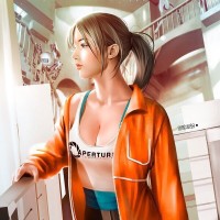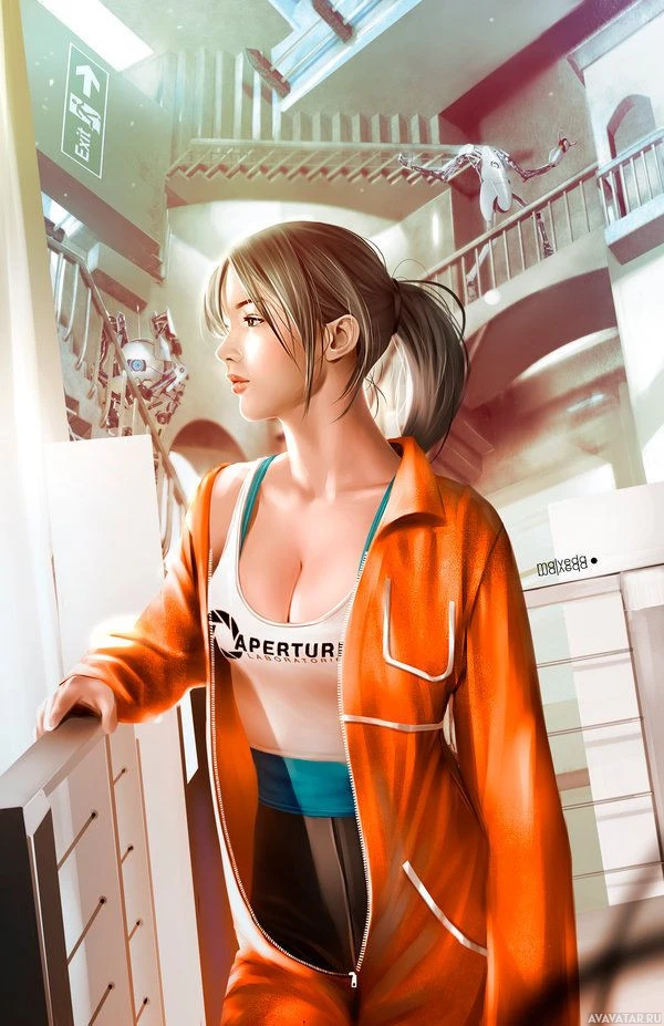 The image features a stylized illustration of a girl in an orange jumpsuit, reminiscent of the uniforms seen in the "Portal" series. She appears to be standing by some sort of elevated platform or structure with