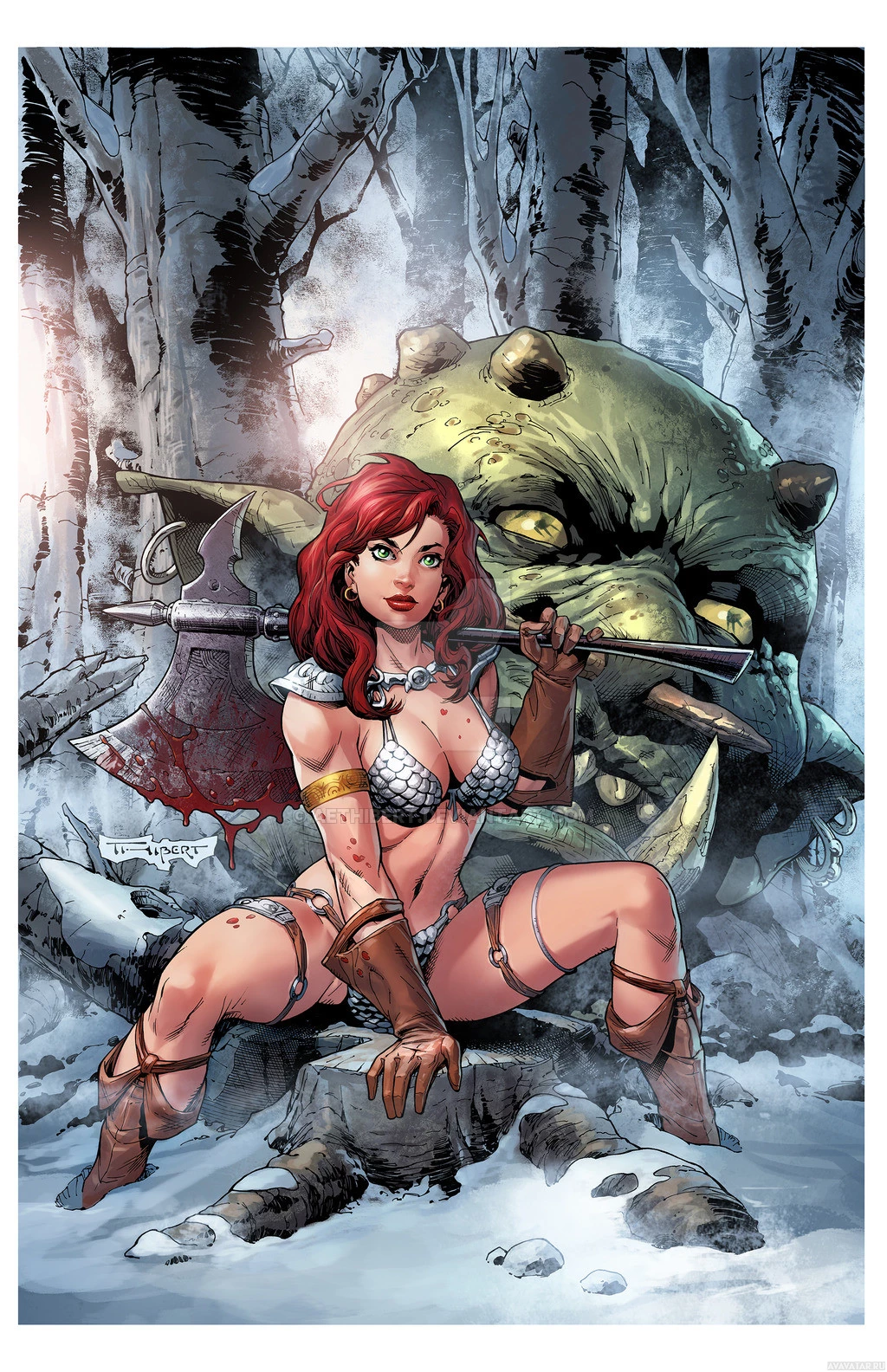 red hair, dressed in what appears to be ancient or barbarian attire, sitting on a rock with an axe resting on her lap. Behind her is a menacing creature that resembles a giant, slimy, frog-like monster with sharp teeth and eyes, which could be interpreted as a fantasy or