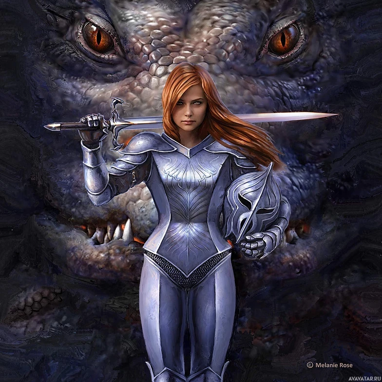 a female character in fantasy attire, resembling a knight or warrior. She is wearing armor and holding a sword, suggesting she may be a fighter or protector in the context of this