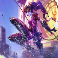 an animated character in the style of Overwatch. This character is known for her abilities and has a distinct appearance with