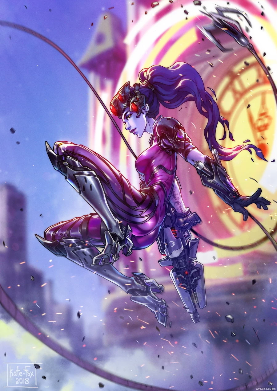 purple hair, a pinkish-red outfit, and mechanical parts that suggest a high-tech design, which is characteristic of her role as Widowmaker in the game Overwatch. She is depicted mid-action, possibly using one of her abilities to launch herself forward. The background features