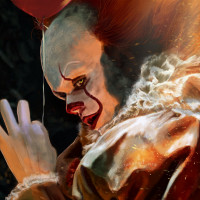 The image depicts a clown character known as Pennywise from the movie "It." He is portrayed with his distinctive red balloon, and there's a sense of menace or creepiness to his appearance, which aligns with the character's role in the story.