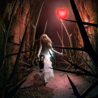 The image shows a girl, who appears to be from behind. She is holding a heart-shaped balloon. The setting seems to be dark and foreboding, possibly resembling the entrance to a haunted or mysterious place due to the presence of what looks like thorny plants and the overall eerie ambiance.