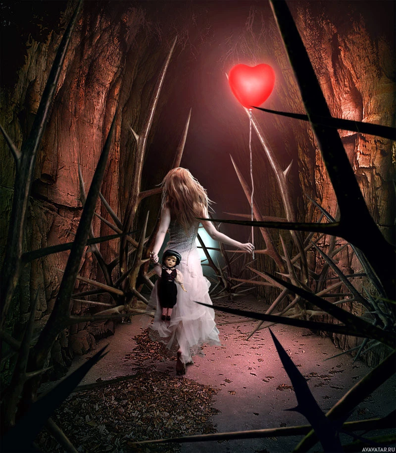 На снимке изображена девушка, которая, кажется, сзади. Она держит шарик в форме сердца. Обстановка кажется темной и предчувствующей, возможно, напоминающей вход в таинственное место из-за присутствия колючих растений и общей жуткой атмосферы.