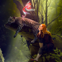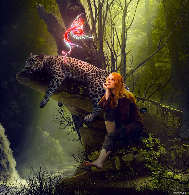 red hair and appears to be deep in thought, resting her chin on her hand. Next to her is a leopard lying down, seemingly asleep or at ease. Above them, there's