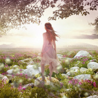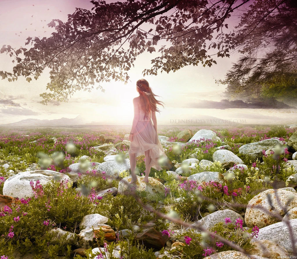 a natural setting with vibrant flowers and rocks around her. She is looking out towards what appears to be an expansive landscape or valley, possibly at dawn or dusk given