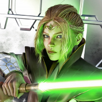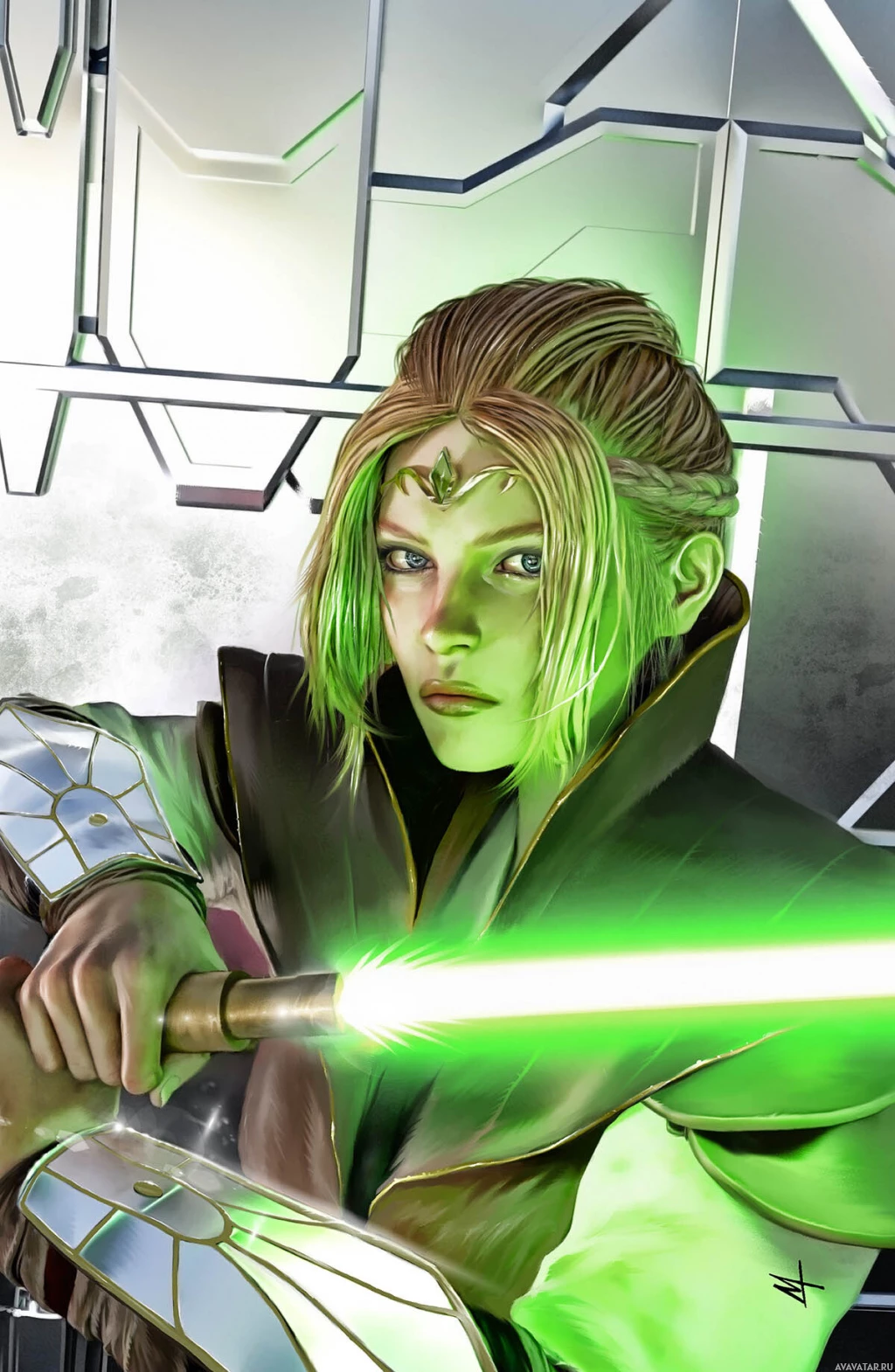 a female character who appears to be inspired by the Star Wars franchise. She is holding a lightsaber in one hand and what seems to be a staff or a weapon with
