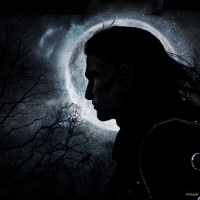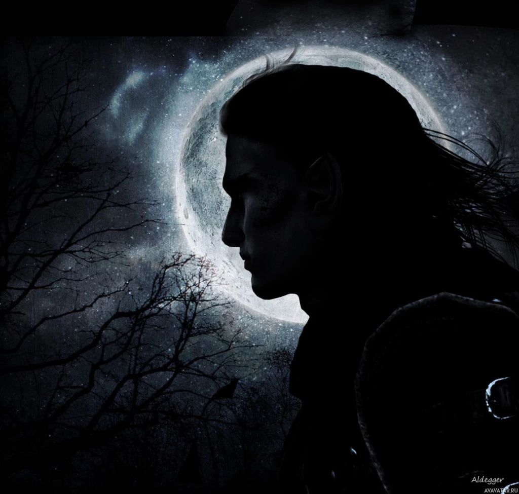 a fictional world. The setting appears to be nighttime, with the moon visible high above the horizon, casting its light over the scene. The silhouette is facing away from us, looking off to their right, giving the impression of