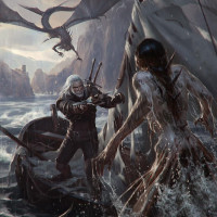 Geralt of Rivia, a witcher known for his skill in monster slaying. He is equipped with a sword and is wearing armor, ready for battle. On the right, there is a woman who appears to be an enchantress or sorceress due to her