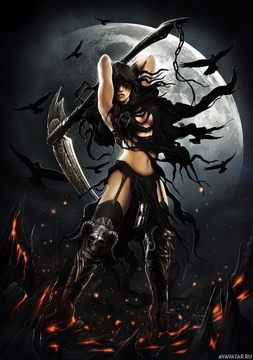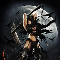 dark hair and is wearing a hooded cloak or outfit that has a gothic or mystical look. She also seems to be holding weapons like axes or swords, suggesting she might be depicted as a combatant or protector. The background includes