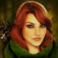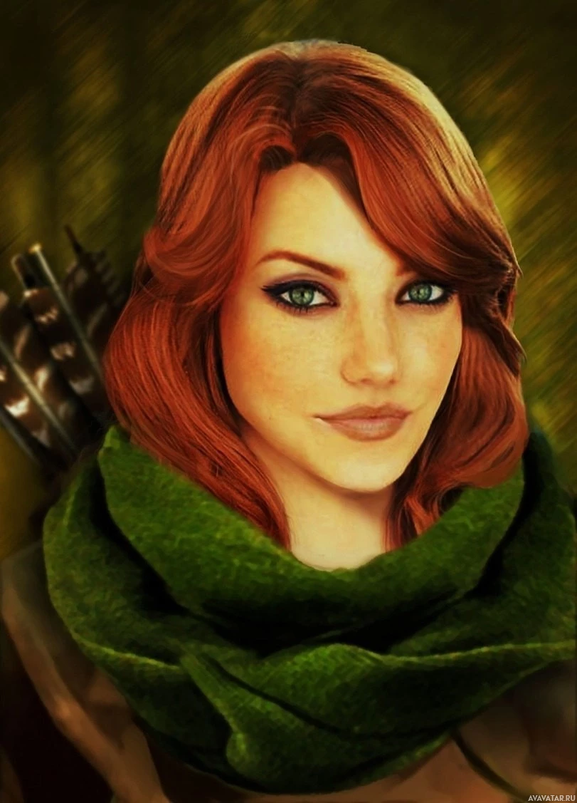 fantasy game environments. Her expression is neutral, and she seems to be looking directly at the viewer.