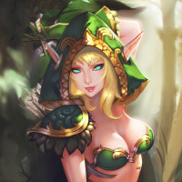 blonde hair and striking blue eyes. She is wearing a costume that includes green and gold armor, with a plumed helmet and what appears to be a quiver on her back, suggesting she might be portraying an archer or hunter role in