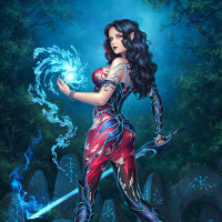 fantasy media. In her right hand, she holds a staff that seems to have
