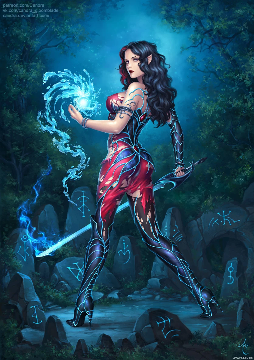 a forest setting, and there are runes etched into the stones around her, which further emphasize the fantasy theme of the image.