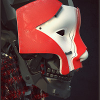 a humanoid robot with a head that has a distinctive red and white mask or covering. The