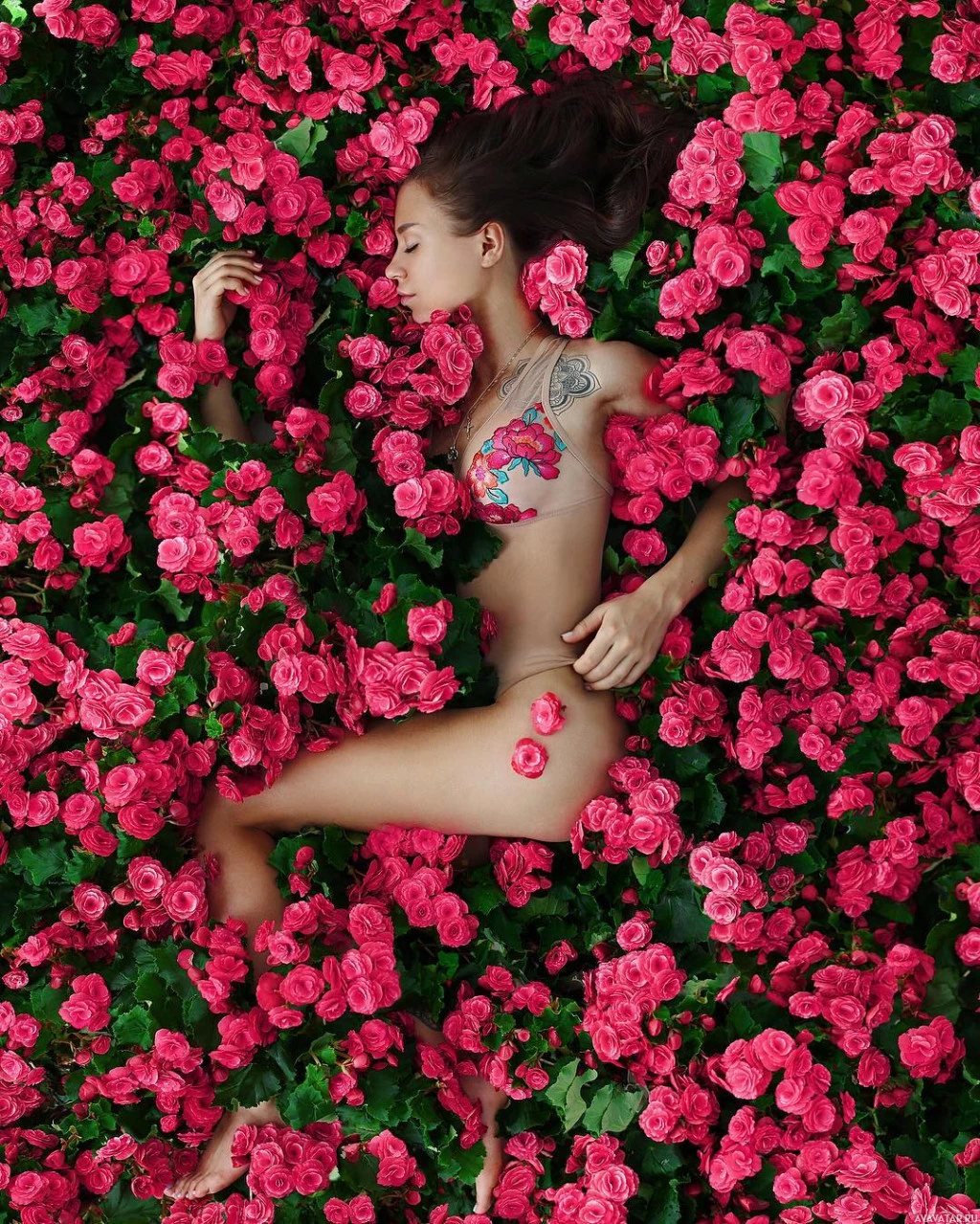 На картинке изображена женщина, лежащая среди цветов с закрытыми глазами. Она, кажется, отдыхает или спит. Цветы ярко-розовые и выглядят как розы, что позволяет предположить, что они могут быть использованы в художественном контексте или в декоративных целях. Фон не виден из-за плотного цветочного дисплея, окружающего ее.