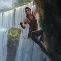 lush greenery, indicating that this scene takes place in a tropical rainforest or mountainous region known for its beautiful natural landscapes. The character is holding onto a rope or harness, which suggests she is ascending