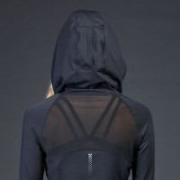 the back view of a person wearing a black long-sleeved athletic top. This type of top typically features a mesh or lace design for breathability, and it appears that this one does as well. There is a visible zipper on the back, suggesting that the garment can be opened or closed to fit the wearer's needs. The person is also wearing black pants, which are likely part of an athletic outfit designed for comfort and flexibility during