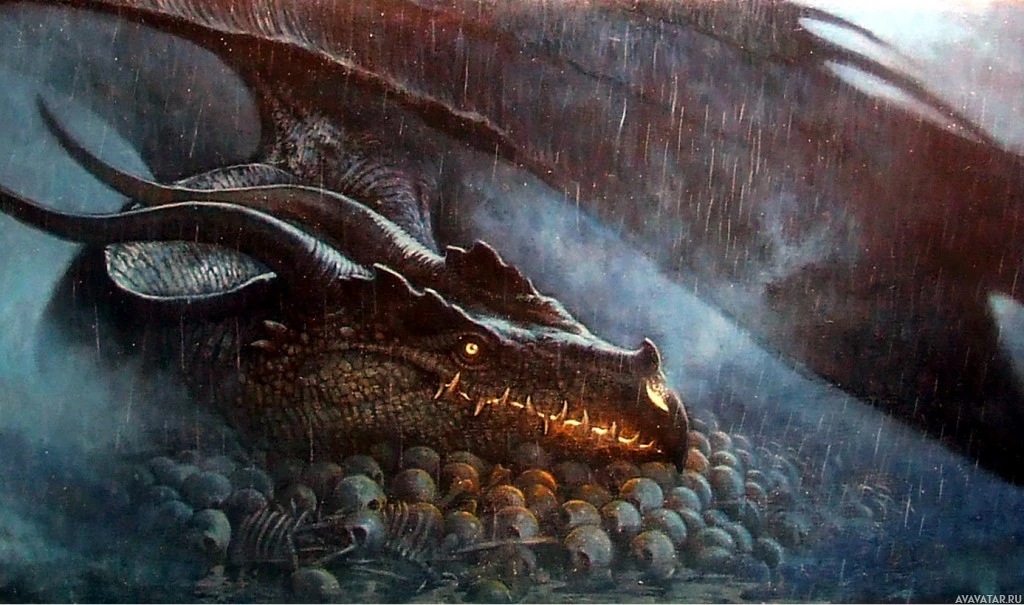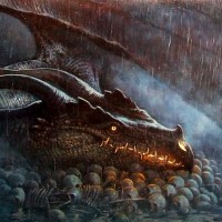 feel of the scene. The dragon's body is coiled and its head rests on the smaller creatures, who seem to be guarding