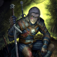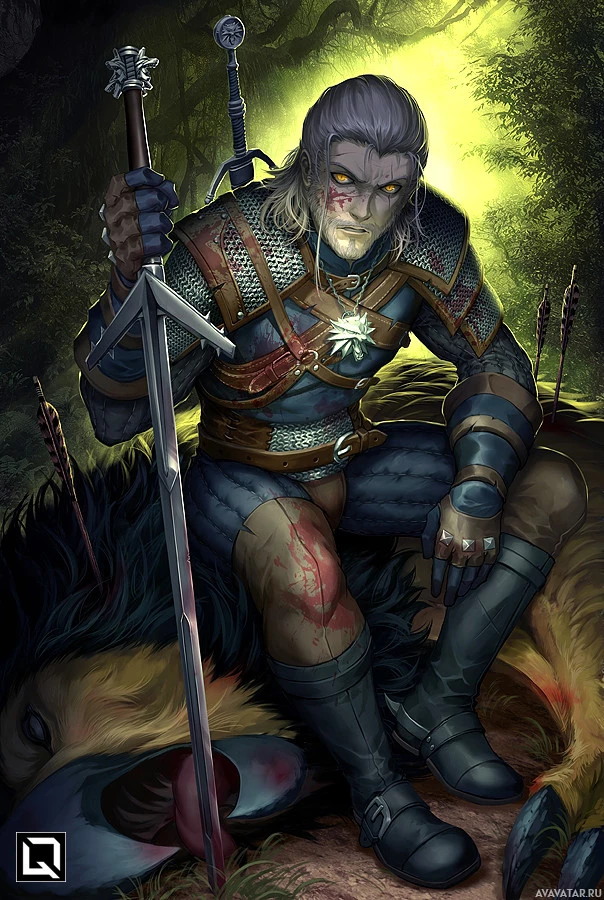 The image depicts an illustrated character who appears to be Geralt of Rivia, a protagonist from