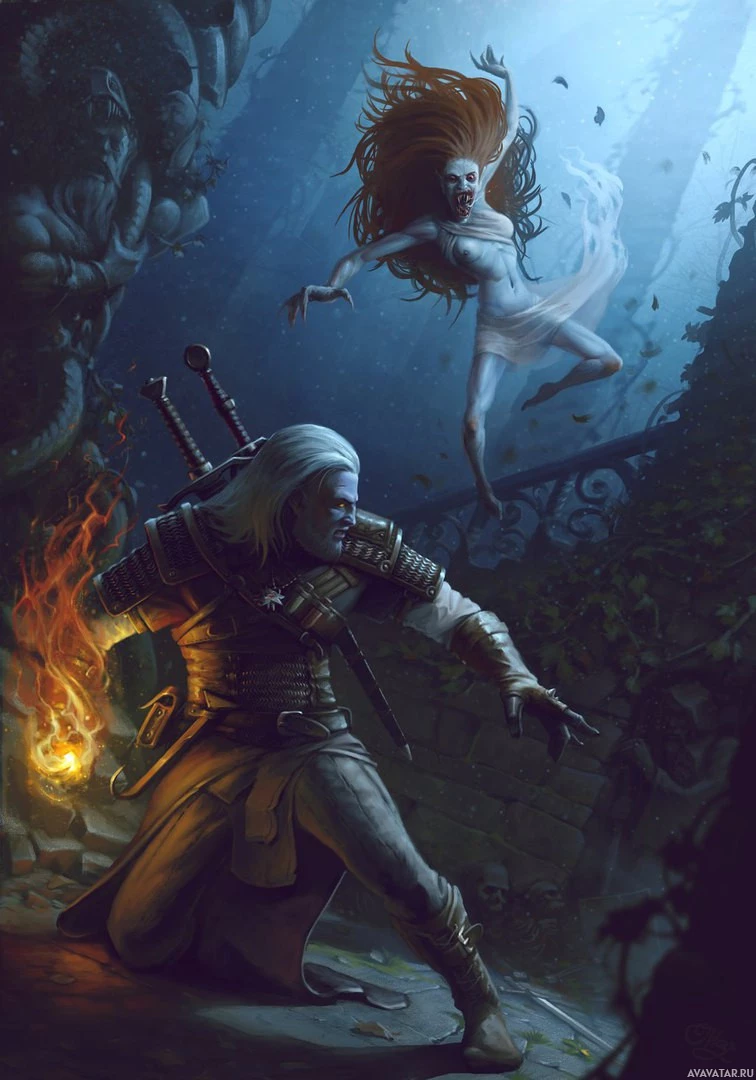 Geralt of Rivia, who is known as the White Wolf. He is holding his sword in one hand and a torch in the other, looking focused and ready for combat. Behind him stands a figure with long,