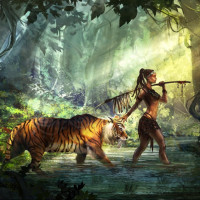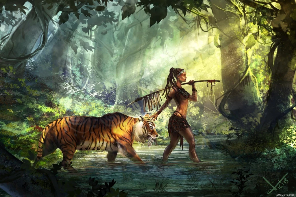 long hair and is carrying a spear. In the foreground, there are two tigers; one is larger and more prominent than the other. The atmosphere of the image suggests a peaceful coexistence between the girl and the animals in their