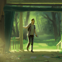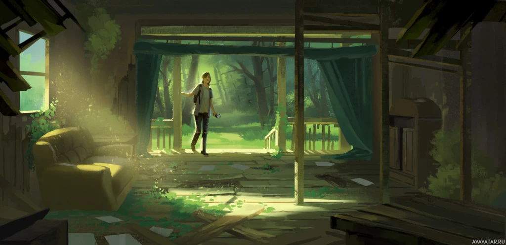 a young girl standing in the doorway of an old, dilapidated house. She is holding what appears to be a flashlight. The setting seems to be during twilight or dawn, as indicated by