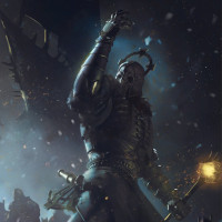battle scene. The setting is dark and moody, with snow falling, which fits the theme of the game's medieval