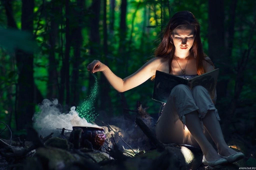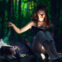 На картинке изображена молодая женщина с рыжими волосами, сидящая в лесу. Она носит верхнюю часть танка и шорты, а ее ноги скрещены, когда перед ней открыта книга. На открытых страницах книги появляется какой-то порошок или вещество. Сеттинг имеет волшебное ощущение с наличием деревьев и того, что кажется зачарованной атмосферой.