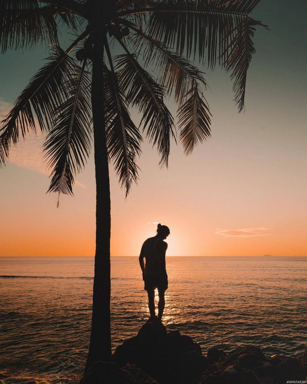 a silhouette of a person standing on a rocky outcrop near the ocean. The sun is either rising or setting, creating