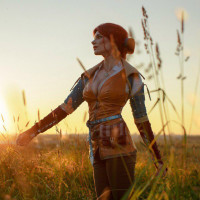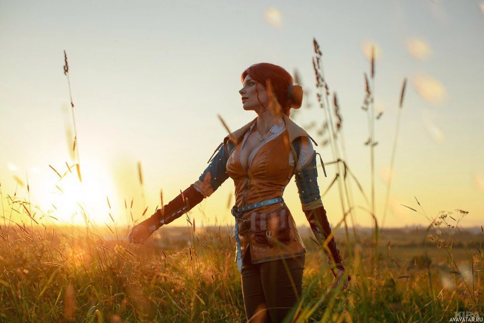 a field at sunset. She is dressed in attire that resembles the character Triss Merigold from