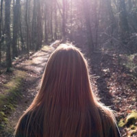 The image shows a person walking in a forested area. The back of the individual's head is visible, suggesting they are facing away from the camera. The sunlight filters through the trees, creating a serene and natural atmosphere. The setting appears to be an outdoor trail or path within a wooded environment.