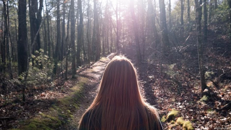 На снимке изображен человек, идущий в лесной местности. Задняя часть головы человека видна, предполагая, что они обращены в сторону от камеры. Солнечный свет фильтрует деревья, создавая безмятежную и естественную атмосферу. Обстановка, по-видимому, является наружной тропой или тропой в лесистой среде.